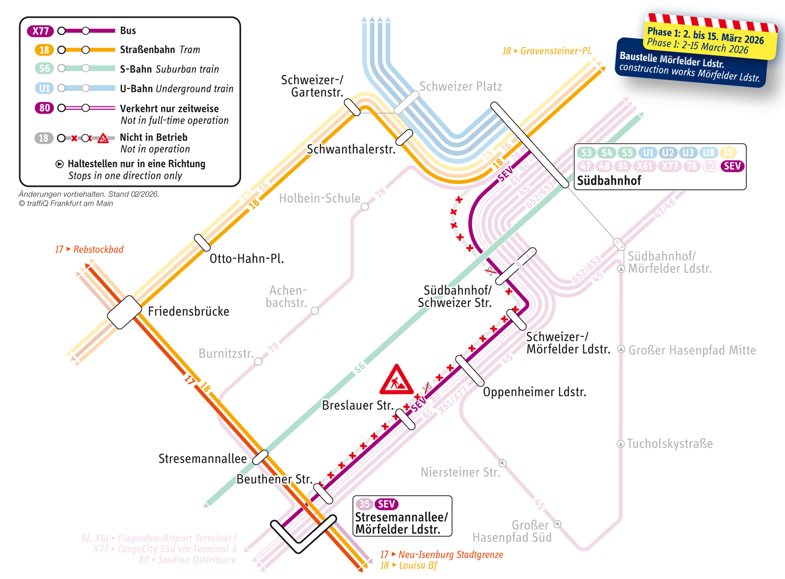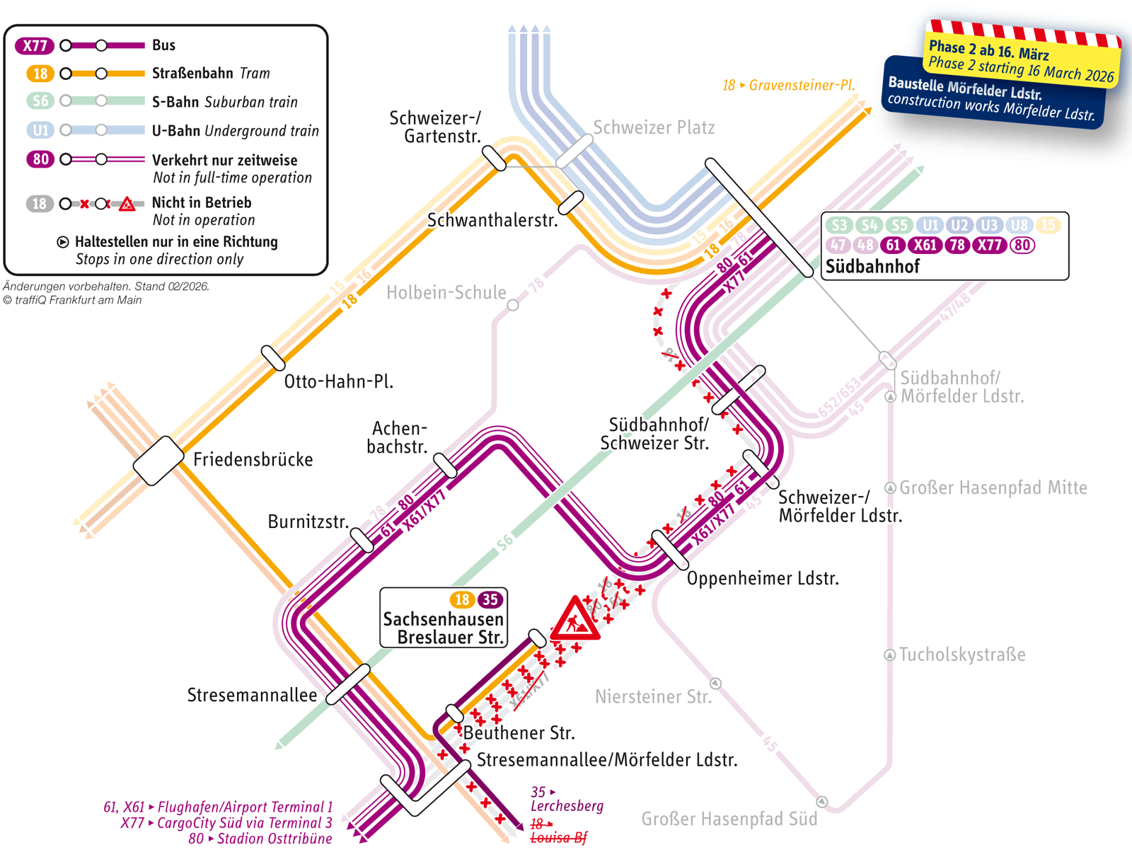 Und auch die Bus-Linien X61, X77, 61 und 80 können ab 16. März 2026 nicht mehr über die Mörfelder Landstraße fahren. Sie werden zwischen Oppenheimer Landstraße und Stresemannallee über Holbeinkreisel, Burnitzstraße und Oskar-Sommer-Straße umgeleitet. Sie bedienen dabei auch die Haltestelle “Stresemannallee”, wo sie eine zusätzliche Umsteigemöglichkeit zur S-Bahn-Linie S6 bieten.
