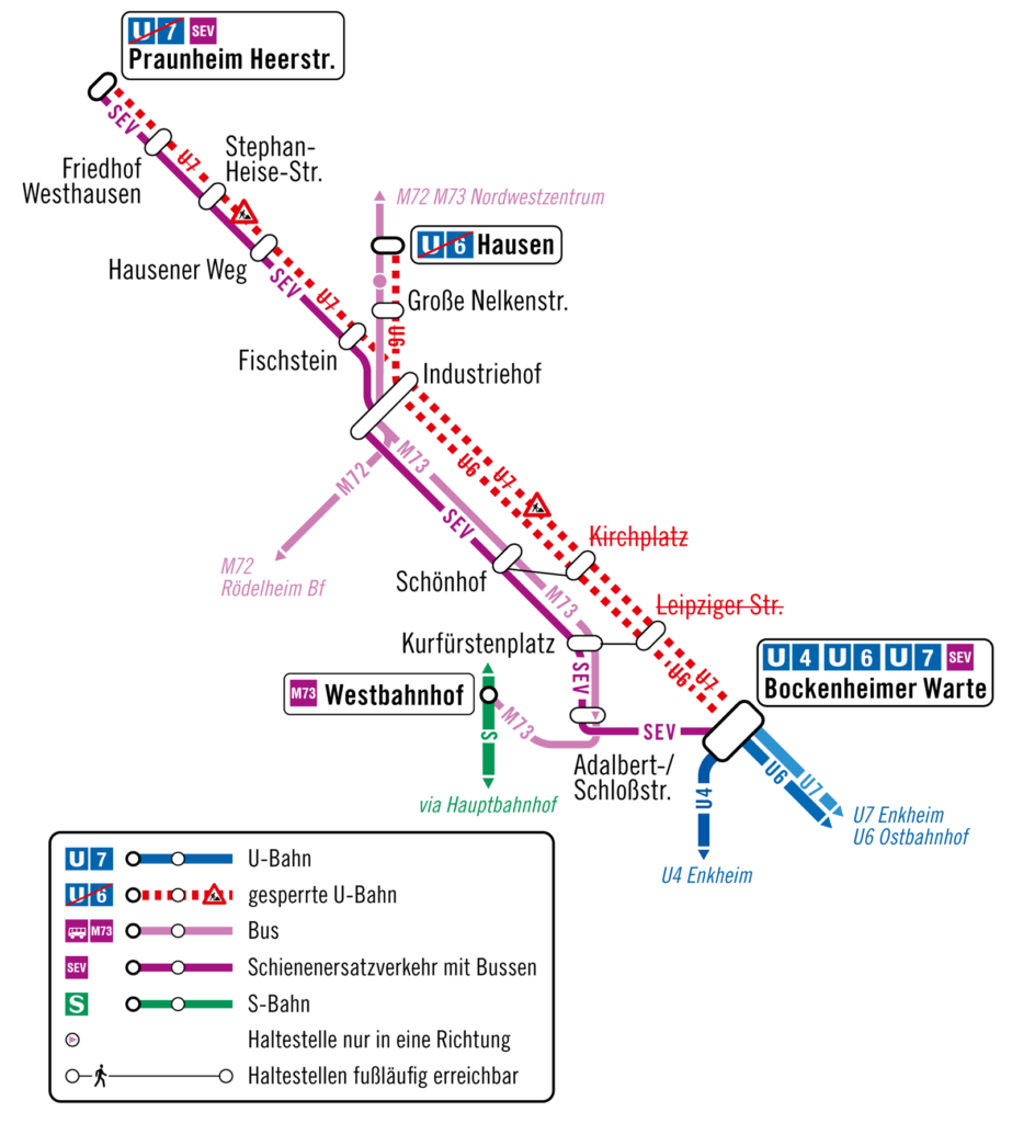 Zwischen den Stationen “Bockenheimer Warte” und “Heerstraße” wird Ersatzverkehr mit Bussen eingerichtet. Fahrgäste von und nach Hausen nutzen bitte bis zur/ab der Haltestelle “Industriehof” die Metrobus-Linien M72 und M73.